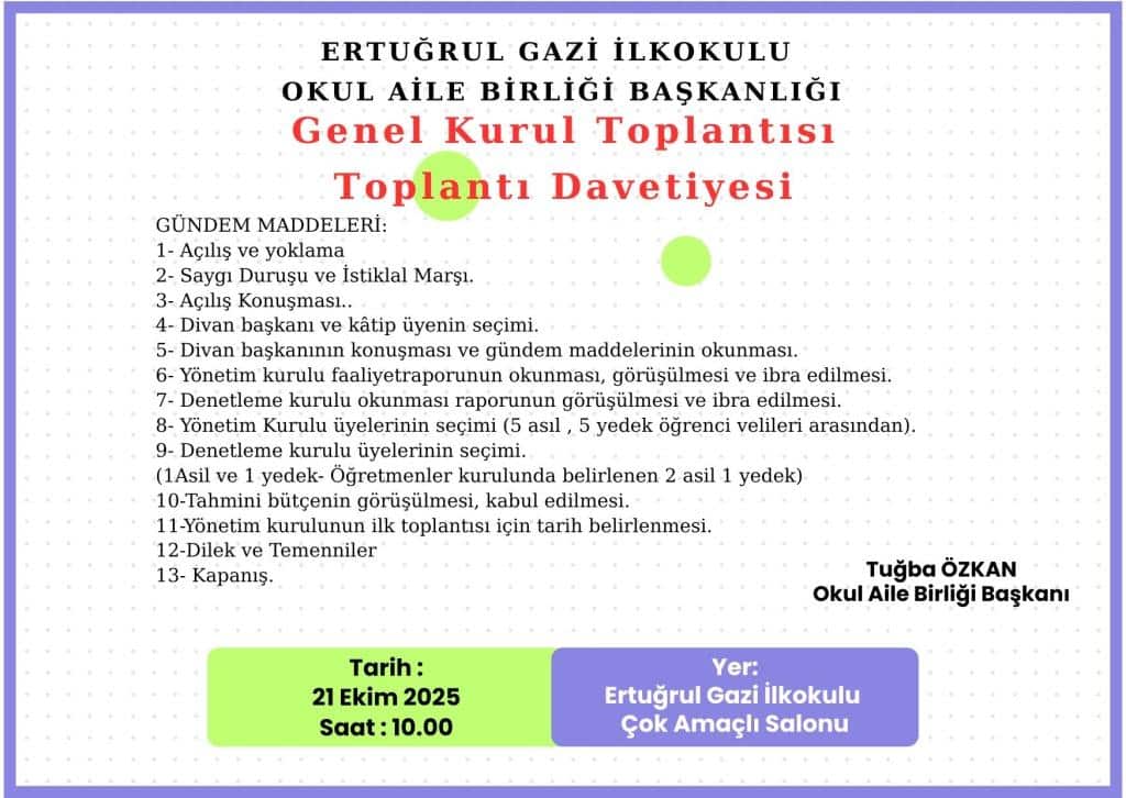 Okulumuz Aile Birliği'nin 2025/2026 Eğitim öğretim Yılı Olağan Genel Kurulu Toplantısı 21 Ekim 2025 SALI günü saat: 10.00'da okulumuz toplantı salonunda aşağıdaki gündem ile yapılacaktır.